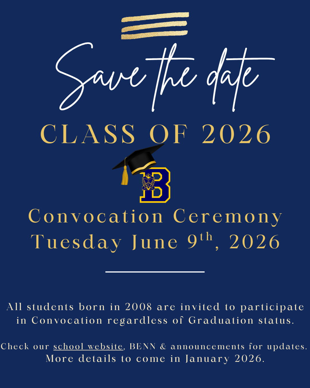 Convocation is a celebration of all students of the Class of 2026 (all students born in 2008) regardless of Graduation status.
