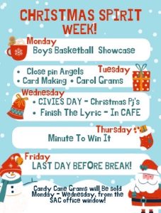 To help you all get into the holiday spirit during this last week, we have a bunch of fun events happening around the school every day this week — so make sure you and your friends help spread some Christmas cheer!
